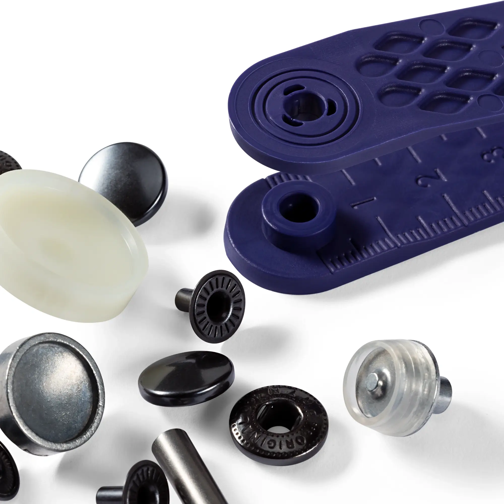 Los botones de presión sin coser “Anorak” son perfectos botones de presión para chaquetas, anoraks, vestidos, faldas y textiles hechos de cuero fino gracias a su fuerza de cierre media. La característica especial es el alambre de resorte de bronce (S-spring), que garantiza una función de apertura y cierre suave. Los botones automáticos están hechos de latón inoxidable y están disponibles en varias superficies, como plata, oro, latón antiguo, cobre antiguo, hierro antiguo o bruñido. Otra variante atractiva es el capuchón lacado en blanco y negro. Las herramientas y las instrucciones están incluidas en el paquete, ¡así que puede comenzar de inmediato! Alternativamente, los botones de presión “Anorak” también se pueden fijar con los alicates VARIO o el trípode.