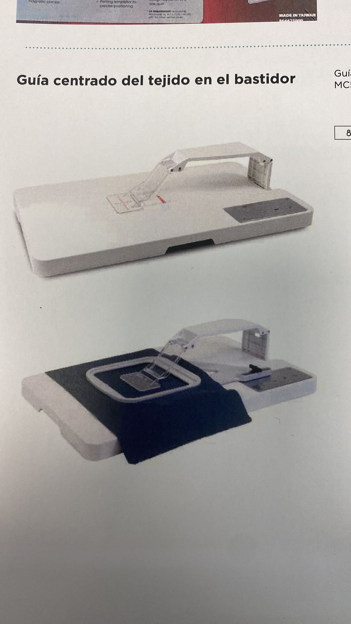 Accesorio utilizado para hacer calces o cuadraturas exactas en las prendas, realizar secuencias o bordados continuos en trabajos como: accesorios, sabanas, cortinas, entre otros.
