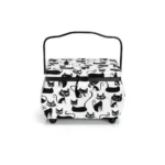 Por fin, algo para mantener en orden tus cosas de costura: el costurero cuadrado Kyoto, cuidadosamente diseñado, tiene un lugar para cada uno de tus utensilios. El interior rojo es inusualmente espacioso, mientras que el inserto de plástico transparente extraíble con cuatro compartimentos almacena carretes de hilo clasificados por color, rotuladores y mucho más. La combinación del algodón azul marino con un patrón geométrico moderno y un mango y bordes rojos de moda hacen de este diseño un verdadero ganador. El costurero se puede abrir y cerrar fácilmente mediante un cierre magnético. Perfecto para almacenamiento y transporte.