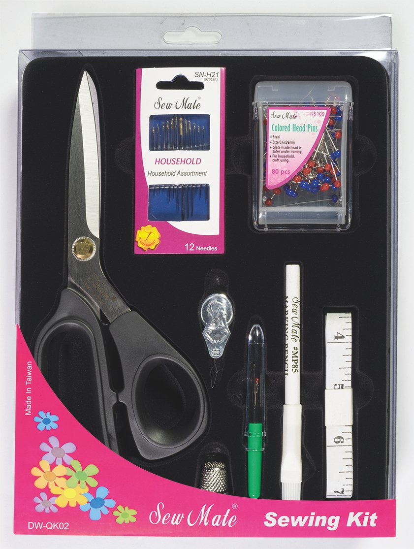 Estuche de plástico con cierre de seguridad que contiene los elementos básicos para realizar patchwork: tijeras, cutter rotativo de 28 mm, metro enrollable, agujas coser a mano, marcador de plástico, saca hilos, regla lápiz con pincel de plástico, dedal metálico, dedal de piel y rotulador borrable.