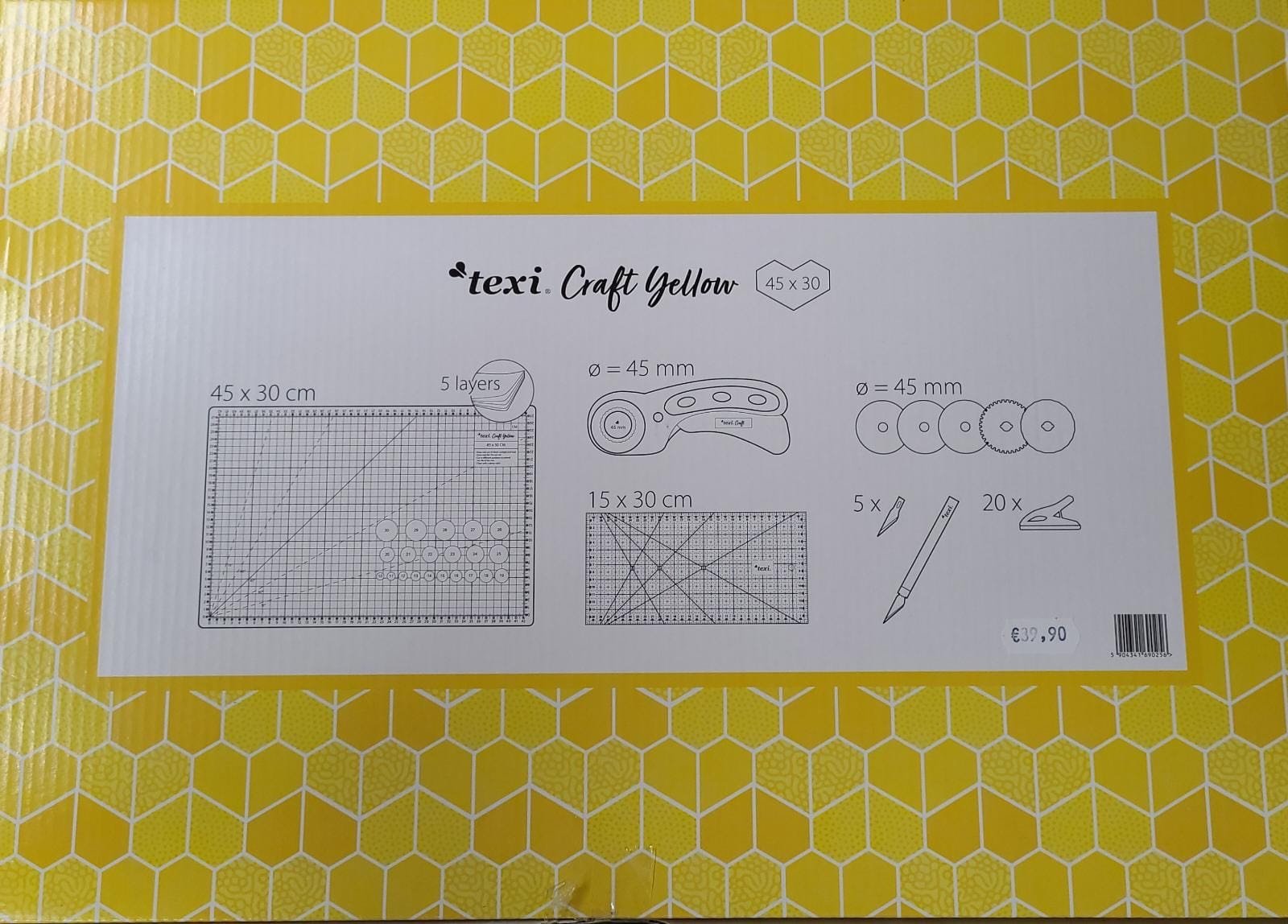 El Kit TEXI CRAFT 45X30 incluye: • 1 Base de corte autorreparable•1 cutter circular con cuchillas de repuesto•1 regla profesional para patchwork y quilting.•1 cutter mini artesanal con hojas de repuesto.•Pinzas para sujetar el tejido • antideslizantes.