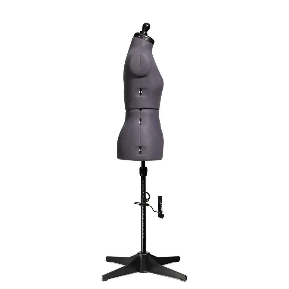 El maniquí Multi “Prymadonna” en un elegante color gris tiene todo lo que se puede esperar de un maniquí, además de que también es adecuado para formas de pantalón. La base se puede insertar lateralmente en el maniquí, lo que garantiza un alto grado de estabilidad y hace que sea cómodo de montar y trabajar en perneras de pantalón individuales. Su torso giratorio consta de 8 partes, lo que permite ajustar el maniquí a las proporciones deseadas en el pecho, la cintura y las caderas mediante 12 ajustes. E incluso la longitud del torso se puede extender hasta 4 cm. El ancho del cuello se puede ajustar mediante un pomo giratorio de madera decorativo; también hay un alfiletero integrado en la zona del cuello. La sección de los hombros está elaborada, lo que garantiza que las mangas siempre caigan correctamente. Este maniquí se completa con un marcador de falda o pantalón con fijación con alfileres y un pedestal de plástico estable. Fácil de montar; se incluye un manual de instrucciones para ayudar.