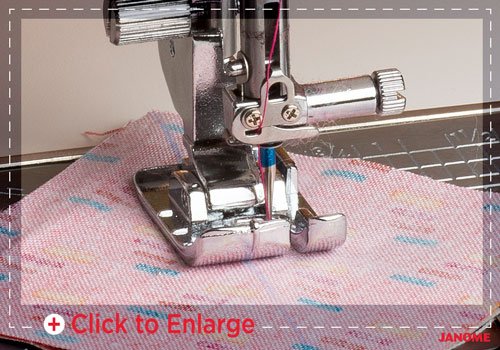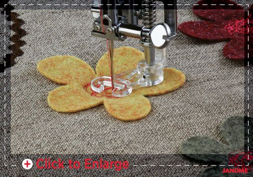 El nuevo prensatelas para zigzag variable (VZZ) con punta abierta (QZ) facilita el seguimiento del progreso de la puntada al utilizar esta función exclusiva de Janome. Vea con precisión dónde desea ensanchar o estrechar su puntada en zig zag con el ajuste de manos libres del levantador de rodilla.