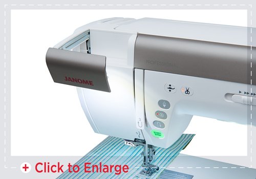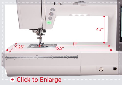 La amplia área de trabajo y el diseño ergonómico permiten más espacio para las colchas. El MC9450 proporciona 11 ”a la derecha de la aguja y 15 ½” de área total de trabajo. El área de la aguja es elegante y recortada para que pueda ver fácilmente mientras trabaja.