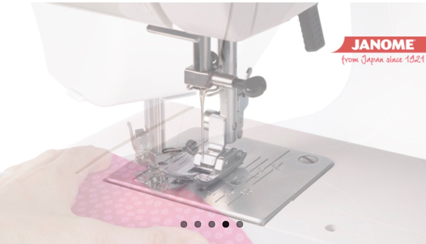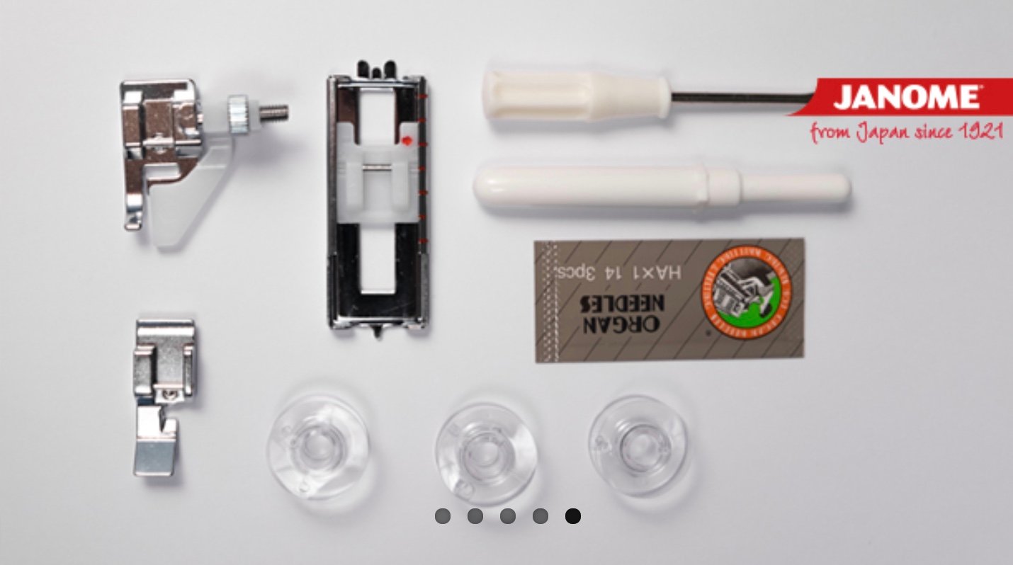 Máquina de coser domestica Janome de brazo libre y lanzadera central oscilante equipada con 15 funciones diferentes. Ojal en 4 pasos, velocidad máxima 860 ppm, funda de plástico y soportes para poner los conos de hilo en metal (no plástico).