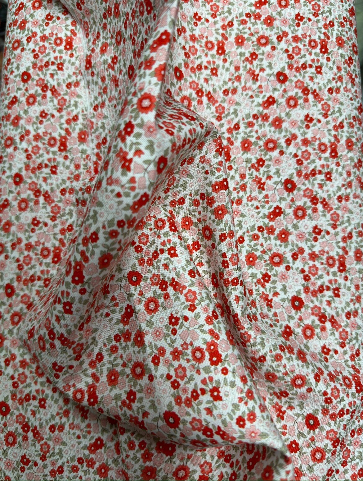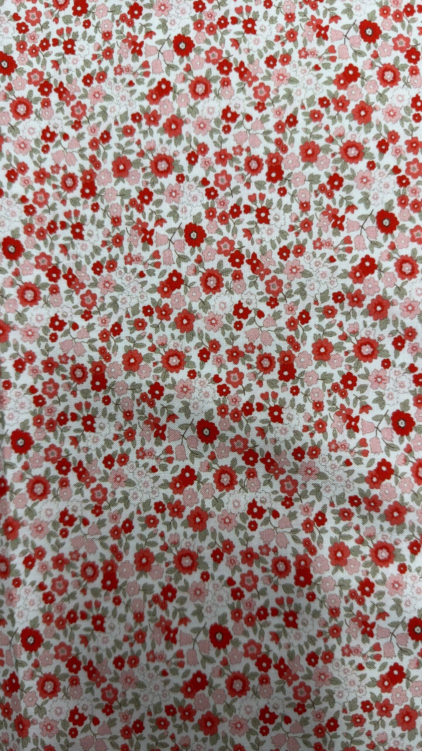 Tejido de algodón 100% en estampado flores estilo liberty en tonalidades rosas-rojizas.