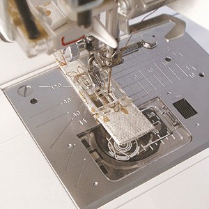 Como en el caso de cuentas y perlas, colocar cintas y lentejuelas es ahora mucho más fácil con la ayuda de nuestro prensatelas especial para cintas y lentejuelas. Este prensatelas dispone de guías gracias a las cuales las cintas y los cordones de lentejuelas se pueden insertar y que permiten una alimentación regular mientras cose. Además de fijar la cinta, puede realizar una puntada en escalera con una cinta estrecha para hacer un cordón de cierre funcional y practico.