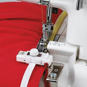 Coser en un elástico puede resultar complicado, sobre todo cuando tiene que estirar el elástico para ampliar su tamaño. El prensatelas para elástico le ayuda a realizar esta técnica más fácilmente.