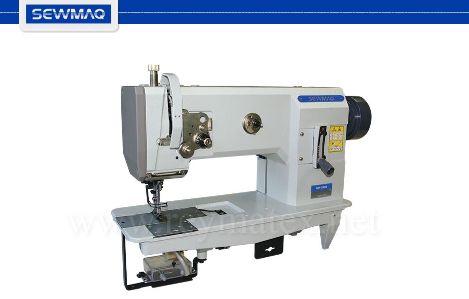 Máquina de coser de triple arrastre de 1 aguja de base plana equipada con garfio horizontal de gran capacidad tipo Pfaff. Lubricación automática del garfio, bobinador integrado en el cabezal. Máxima longitud de puntada: 8 mm. Adecuada para la costura de tapicería, piel y textiles.