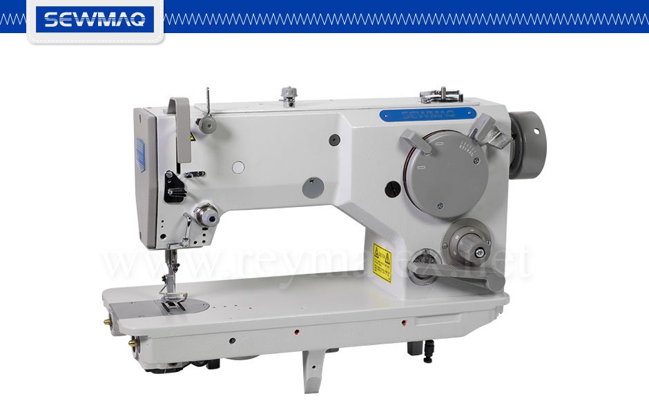 Máquina de zig zag industrial con 3 levas de serie intercambiables para realizar diferentes costuras (pespunte, zig zag y zig zag de 3 puntadas). Equipada con garfio de gran capacidad. Velocidad de 3.500 PPM.