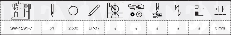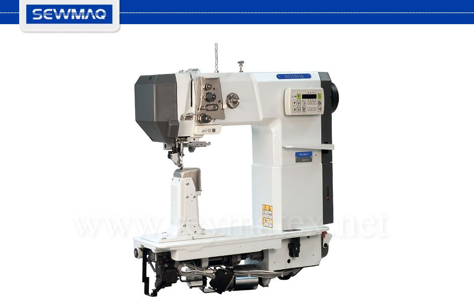 Máquina coser de columna de 1 aguja con garfio de capacidad pequeña tipo Pfaff actual. Transporte por aguja, prensatelas de rueda superior y diente de rueda inferior. Equipada con cortahilos, remates y alzaprensatelas eléctricos y mini motor “Ho Hsing” MD-4-96 de potencia 750 W montado en la parte inferior trasera del cabezal. Incorpora luz de LEDs, palanca de remate y guía abatible.