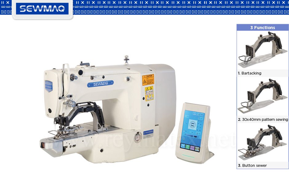 Máquina para coser electrónica multifuncional para coser presillas, botones y costura programada dentro del campo de 40 x 30 mm. Suministrada con todas las piezas necesarias para realizar el cambio rápido de cualquiera de las 3 funciones. Equipada con motor servo en el cabezal, caja de control de aluminio ligera de pequeñas dimensiones y programador táctil de color que permite realizar nuevos diseños para ser cosidos en la máquina.