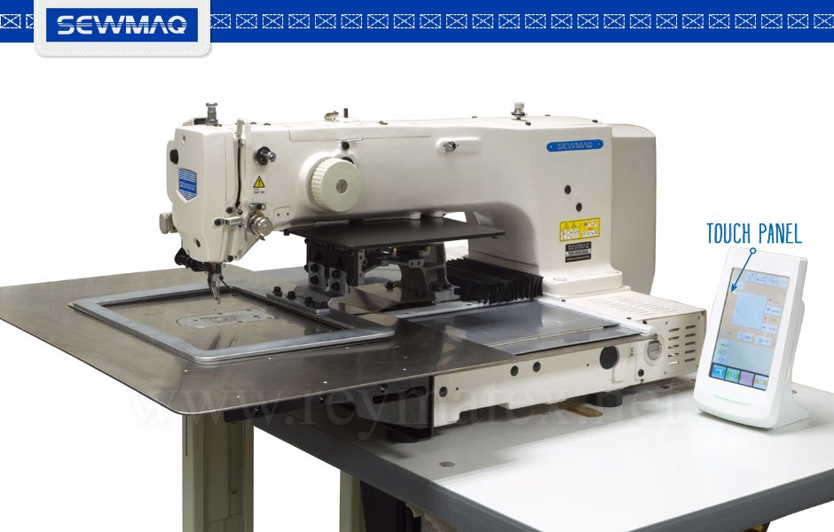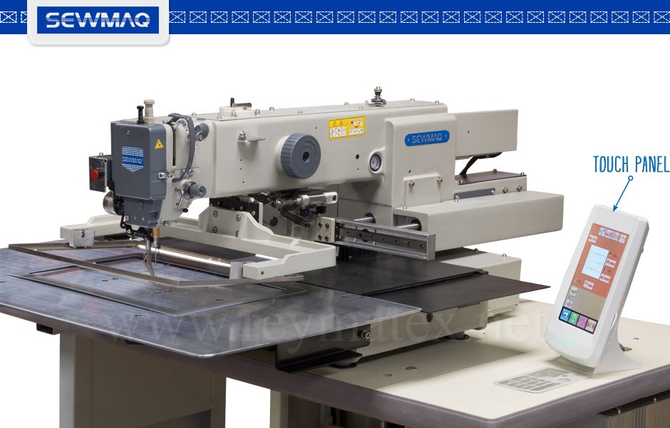 Máquina de costura programable de campo de área de costura 30 x 20 cm. Equipada con cortahilos automático, bastidor neumático de 1 ó 2 tiempos y programador de pantalla táctil. Los nuevos diseños simples pueden ser creados directamente desde el programador y los más sofisticados pueden crearse a través un programa externo (que Reymatex suministra bajo pedido) desde un computador externo y ser transferidos a la máquina a través de un puerto USB. Incluye volteador de etiquetas como equipamiento de serie. El motor principal de 750 w potencia permite coser materiales pesados como la piel.