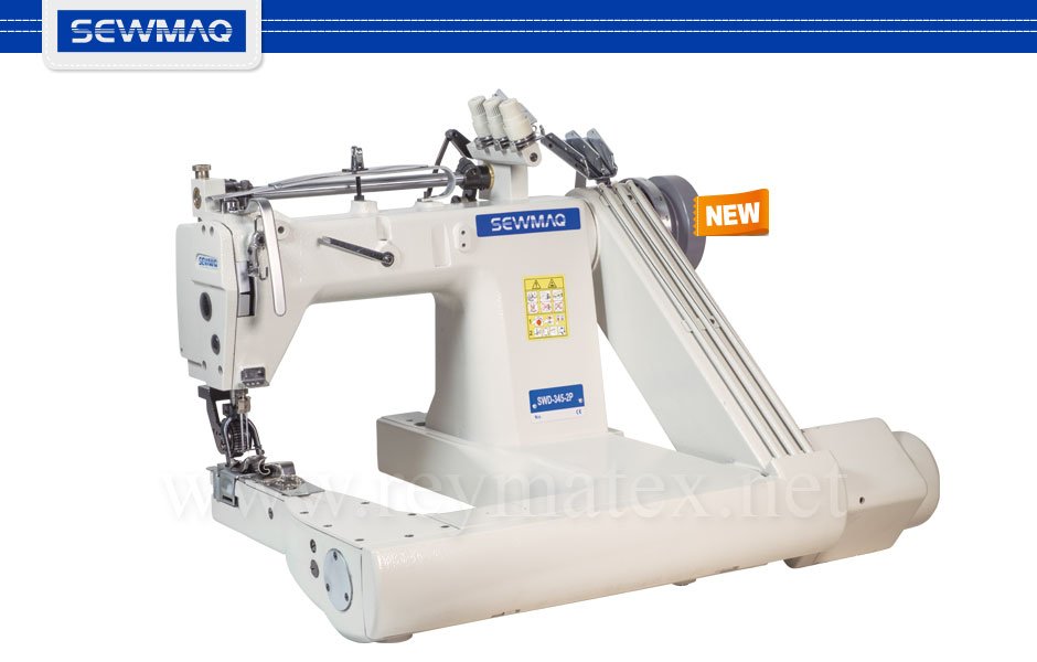 Máquina de brazo para coser cadeneta de 2 agujas 4 hilos galga 3/16” (4.8 mm) de doble cadeneta para cerrar camisas. Incorpora puller trasero de arrastre con rodillo de goma.