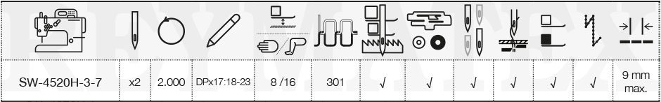 Máquina de coser de dos agujas y triple arrastre con mecanismo de barra de aguja desembragable para la costura de ángulos y esquinas. Equipada con cortahilos