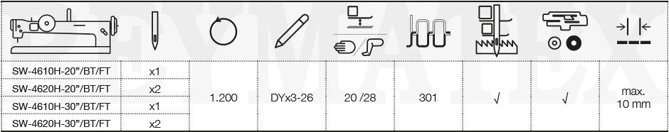Máquina de coser 2 aguja, triple arrastre, puente de 30” (76,2 cm) con garfio de capacidad extra grande, equipada con atacador, alzapatas neumático y mini motor servo 1PH. Altura de prensatelas de 28 mm. Longitud de puntada 10 mm.