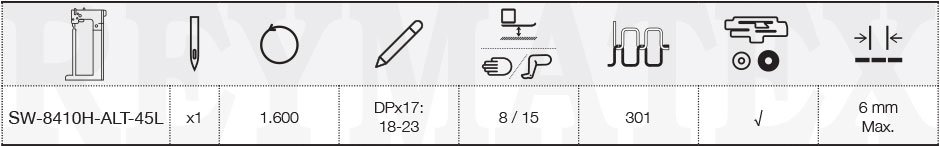 Máquina de coser de columna y triple arrastre de 1 aguja. Equipada con columna estrecha y extra alta de 45 cm situada al lado izquierdo de la aguja. Velocidad máxima 1.600 PPM, máxima longitud de puntada 6 mm. Espacio de trabajo disponible: 25 cm de ancho y 52 cm de alto.