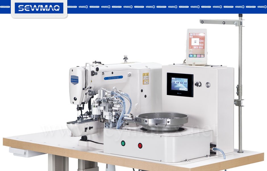 Máquina de coser botones equipada con motor servo en el cabezal y alza prensatelas eléctrico. Velocidad regulable mediante panel. Realiza 3 tipos de puntadas: en cruz, doña agujeros recto y 4 agujeros recto. Incluye luz de LEDs.