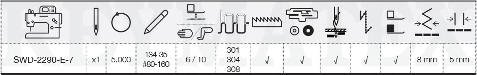 Máquina de zig zag de alta velocidad hasta 5.500 PPM tipo Juki. Ancho máximo de zig zag 8 mm, longitud máxima de puntada 5 mm. Adecuada para coser materiales finos y medios. Equipada con motor servo dentro del cabezal, motores paso a paso para el movimiento de la barra de agujas y el diente de arrastre hacia atrás. Incluye 30 diseños de series y pueden crearse nuevos diseños mediante un PC externo.