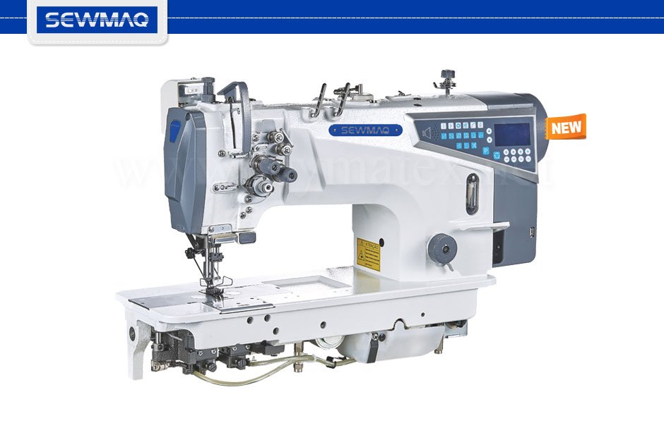 Máquina de coser de 1 aguja de transporte por prensatelas y diente equipada con motor servo en el cabezal. Engrase automático por bomba, longitud de puntada 8 mm, velocidad máxima 2.000 PPM. Garfio vertical de gran capacidad.