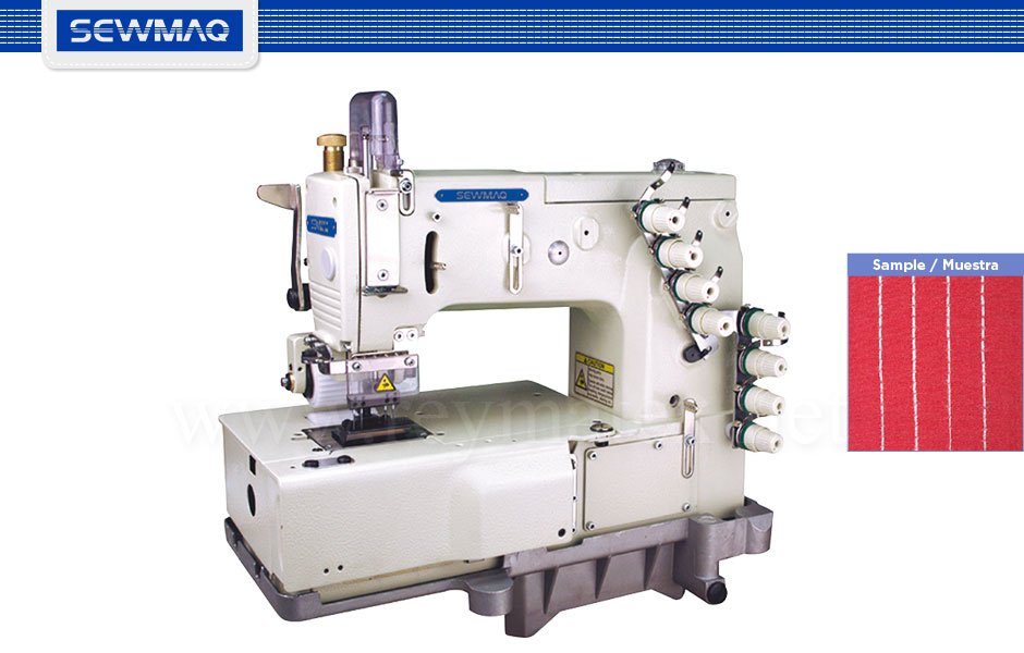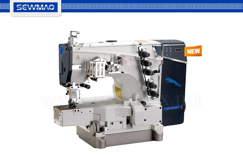 Máquina de base cilíndrica de 3 agujas con recubrimiento superior e inferior equipada con motor servo en el cabezal, cortahilos superior e inferior eléctrico y alzaprensatelas eléctrico.